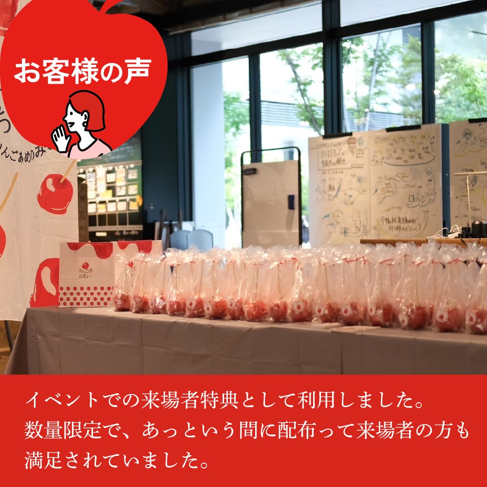 ほどよいサイズ感、国内の貯蔵庫直送の新鮮な国産りんご(シャキシャキとした食感、甘さと酸味の絶妙なバランス。子どもも安心して楽しめるように、飴の厚さにもこだわりました感)、金平糖と同じ製法で作った極薄の飴(パリパリ感)、店内で一つ一つ手作りされた安心安全な品質。