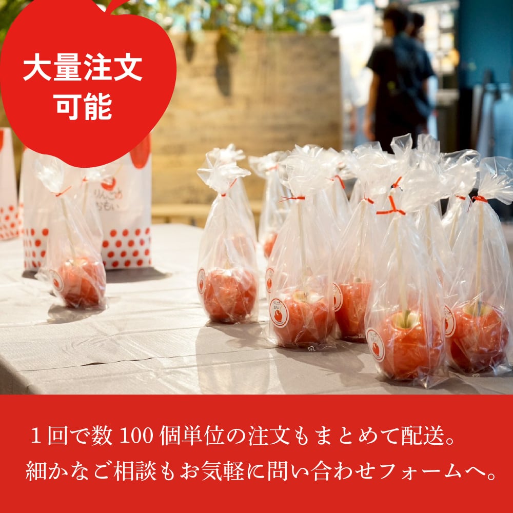 ほどよいサイズ感、青森県の貯蔵庫直送の新鮮な国産りんご(シャキシャキとした食感、甘さと酸味の絶妙なバランス。子どもも安心して楽しめるように、飴の厚さにもこだわりました。金平糖と同じ製法で作った極薄の飴(パリパリ感)、店内で一つ一つ手作りされた安心安全な品質。